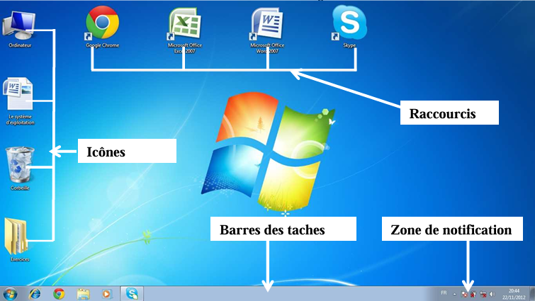 Bureau : est la zone de travail de l’ordinateur. On y trouve des icônes, des Raccourcis , le Menu Démarrer, la Barre des taches, et la zone de notification